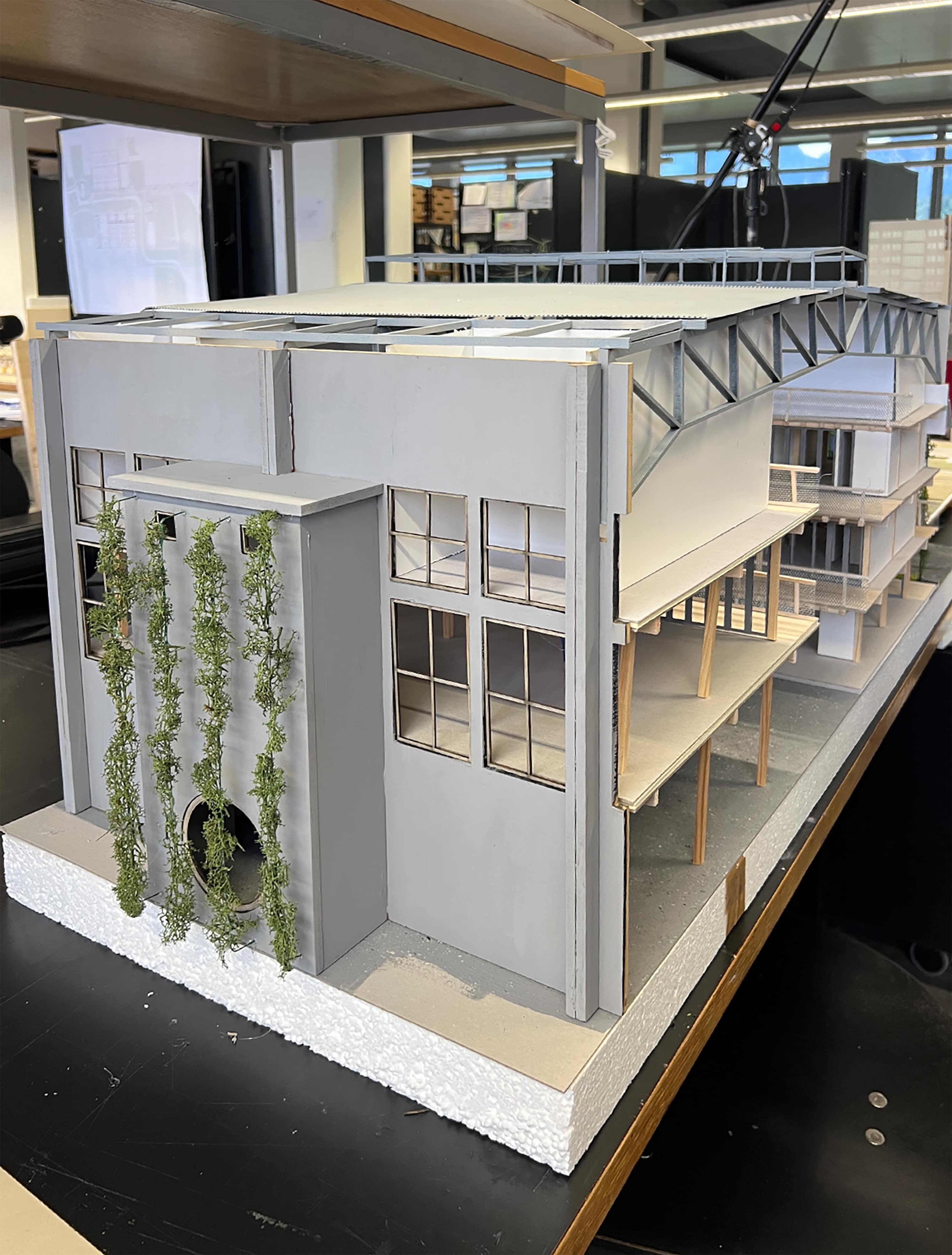 In den Entwurfsmodulen waren die Aufgabenstellungen vielfach offen formuliert und unklar. Ein Beispiel dafür ist der vierte Entwurf «Kontext» im 6. von insgesamt 8 Semestern, der sich mit dem Thema Städtebau beschäftigte. Der Entwurf war als Gruppenarbeit in Zweierteams organisiert, wobei jeder Gruppe ein unterschiedlicher Standort innerhalb der Gemeinde Emmen (LU) zugeteilt wurde. Laut Aufgabenstellung bestand das Ziel darin, «ein tiefgreifendes Verständnis für die ökologischen, soziologischen, kulturellen und nicht zuletzt ökonomischen Rahmenbedingungen eines typisch schweizerischen städtischen Umfelds zu entwickeln.» Solch eine Aufgabenstellung sollte meiner Meinung nach für ein Masterstudium gedacht sein und nicht für das Bachelorstudium, da noch kein Grundverständnis zum Thema Städtebau vorhanden war. Aufgrund dieser Überforderung sind wir schlussendlich von der Aufgabenstellung abgewichen und haben ein Szenario entwickelt, wie sich der nordöstliche Teil des Militärflugplatzes in den nächsten 20 Jahren verändern könnte. Zusätzlich waren die zur Verfügung gestellten Grundlagenpläne für unseren Standort beim Militärflugplatz Emmen unvollständig und ungenau. Konstruktionen mussten anhand von Fotografien interpretiert werden, während Distanzen und Masse teilweise geschätzt werden mussten. Für einen städtebaulichen Entwurf wäre dies grundsätzlich in Ordnung, jedoch waren am Ende trotzdem Grundrisspläne erwünscht, wo die Nutzungen inklusive Möblierung ersichtlich waren. Ähnlich offen gestalteten sich auch die Abgabeanforderungen. Zwar waren Modelle und Pläne grundsätzlich erwartet, doch weder Anzahl noch Art der Pläne und Modelle waren klar festgelegt und konnten ausgehandelt werden. Wenn begründet werden konnte, warum beispielsweise keine Fassaden oder Schnitte notwendig seien, mussten diese Pläne nicht zwingend erstellt werden. Wir verzichteten beispielsweise auf Fassadenpläne (siehe Abgabepläne) und bauten ein Modell als Querschnitt durch den Hangar (das Gebäude, welches wir bearbeiteten), in dem lediglich ein Fassadenausschnitt sichtbar wurde. Trotzdem haben wir das Modul bestanden – obwohl Fassadenpläne eigentlich immer zu einem Projekt gehören.