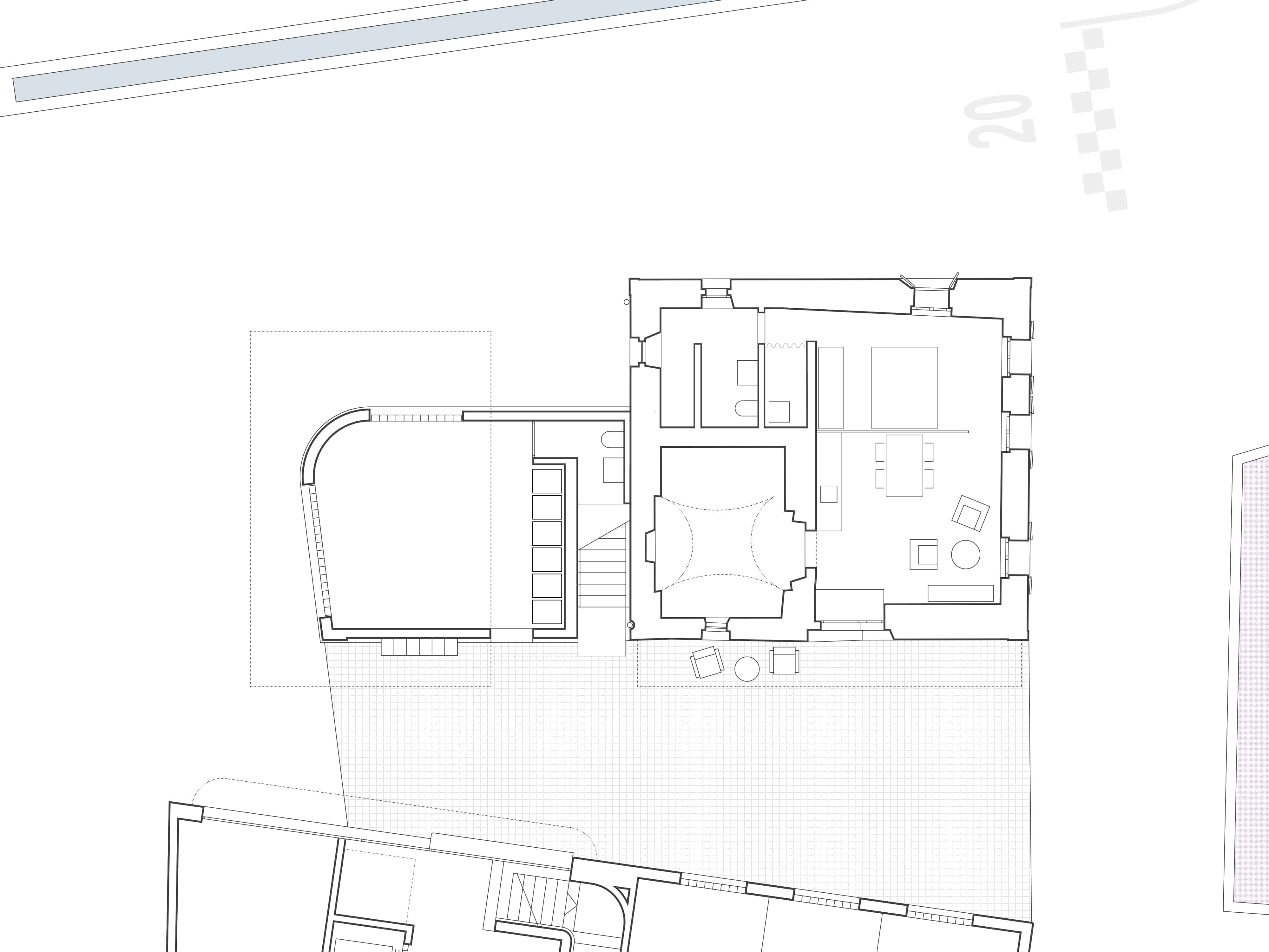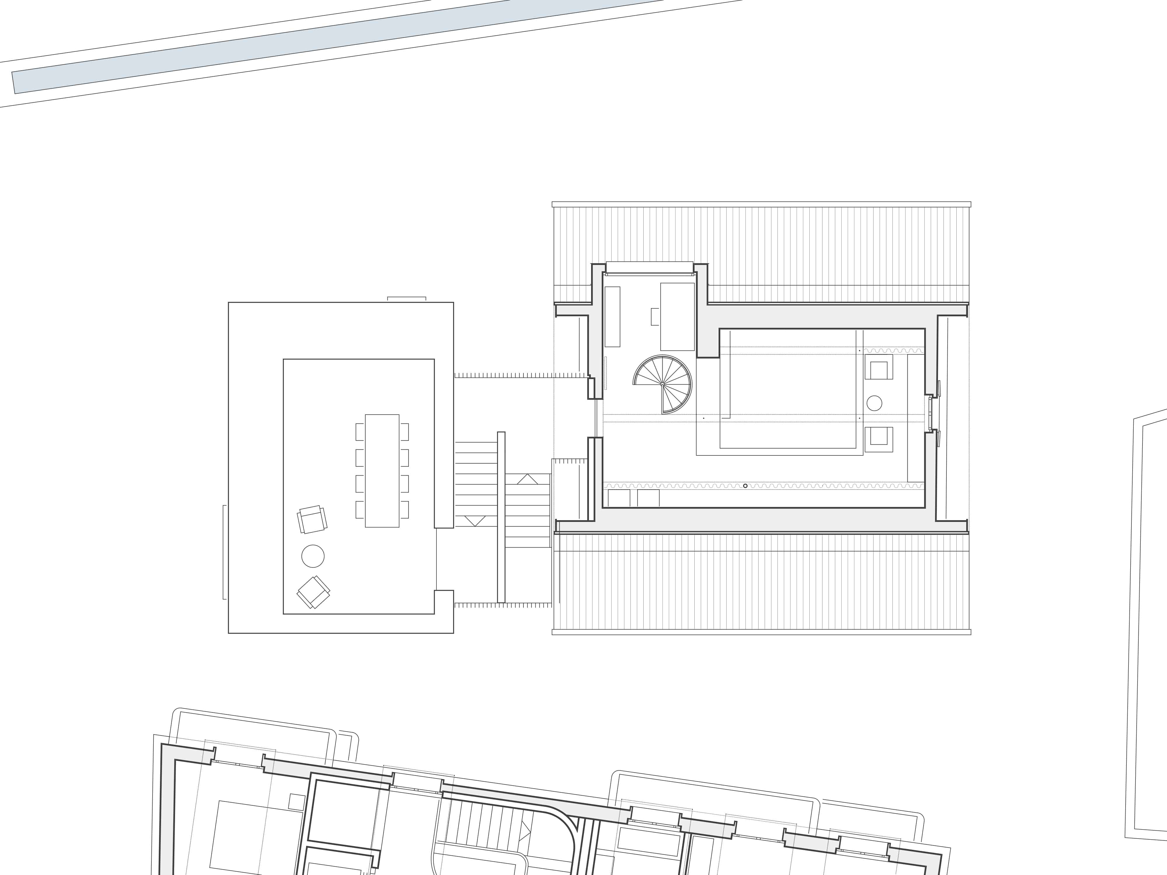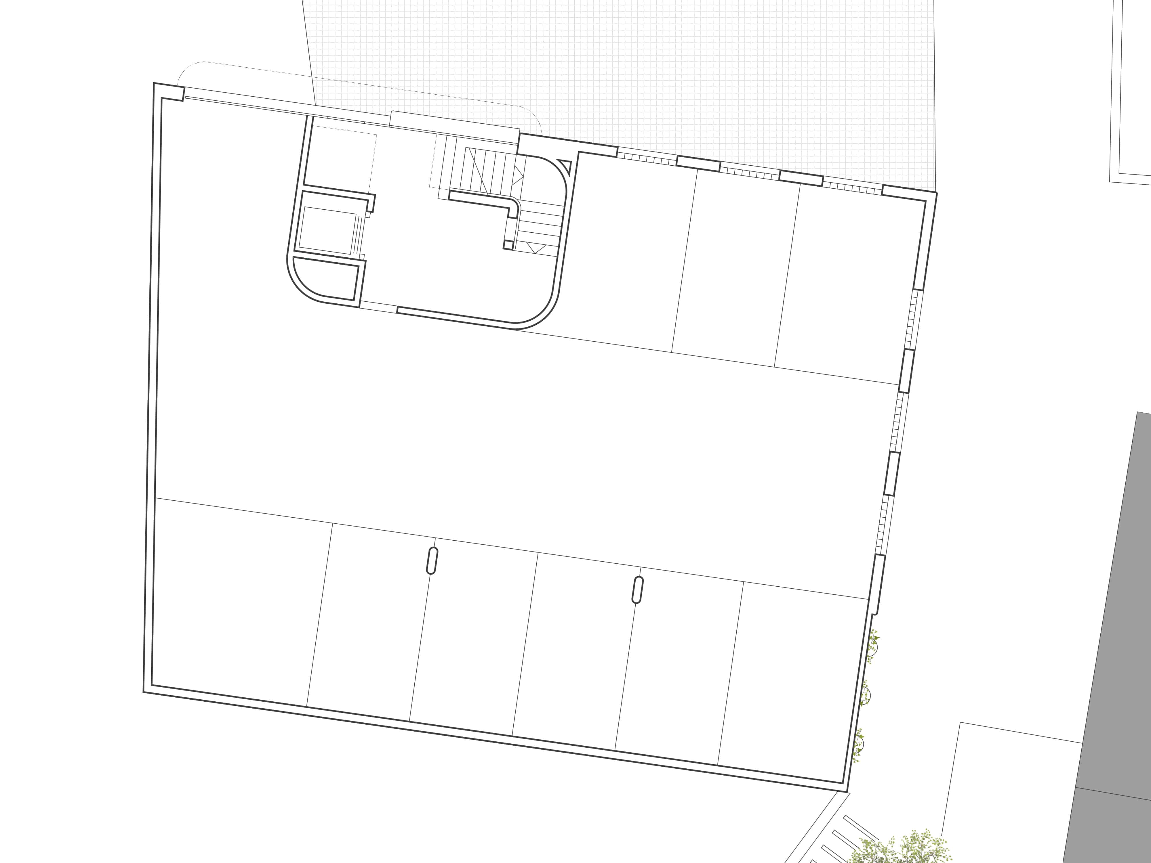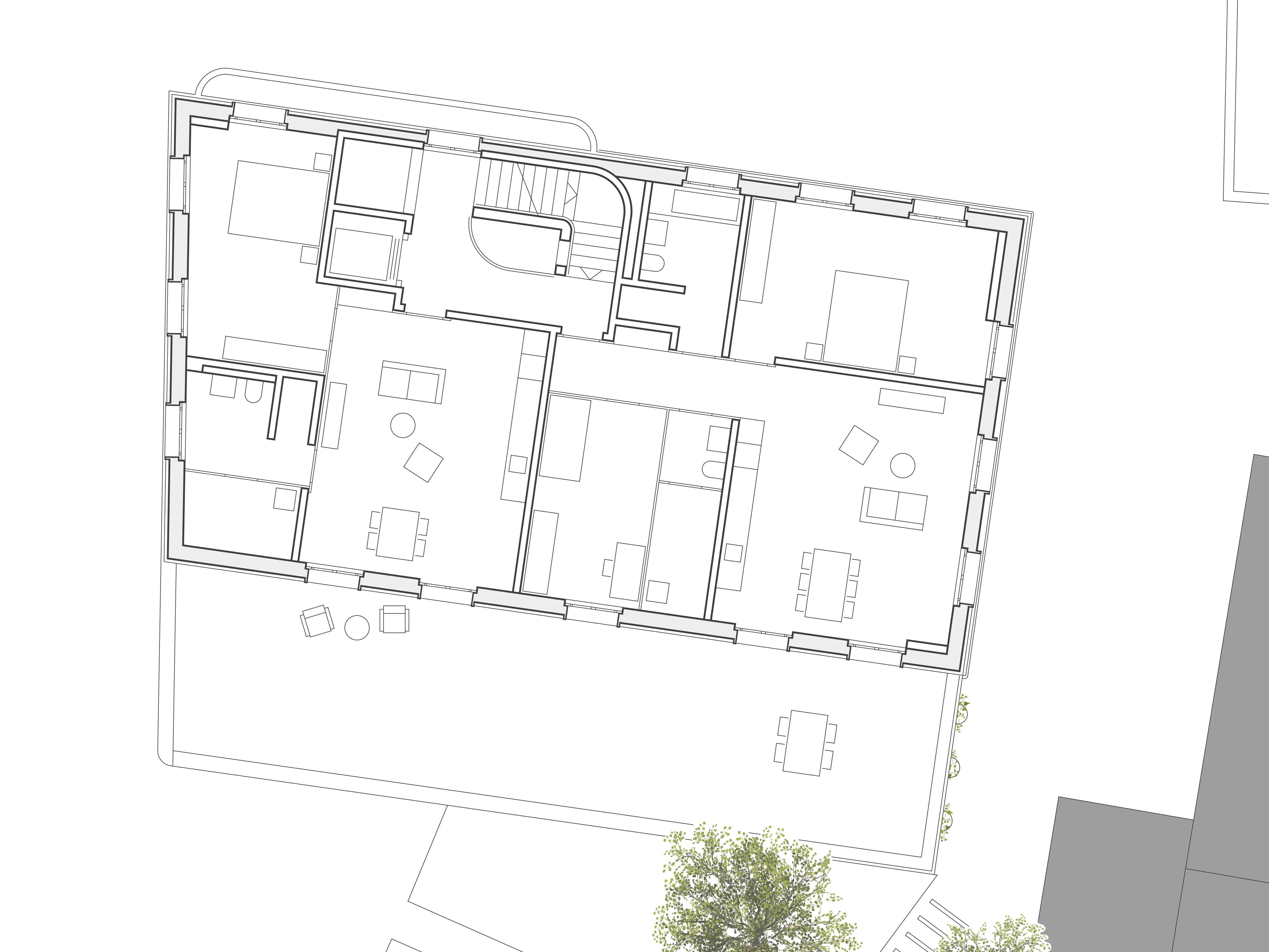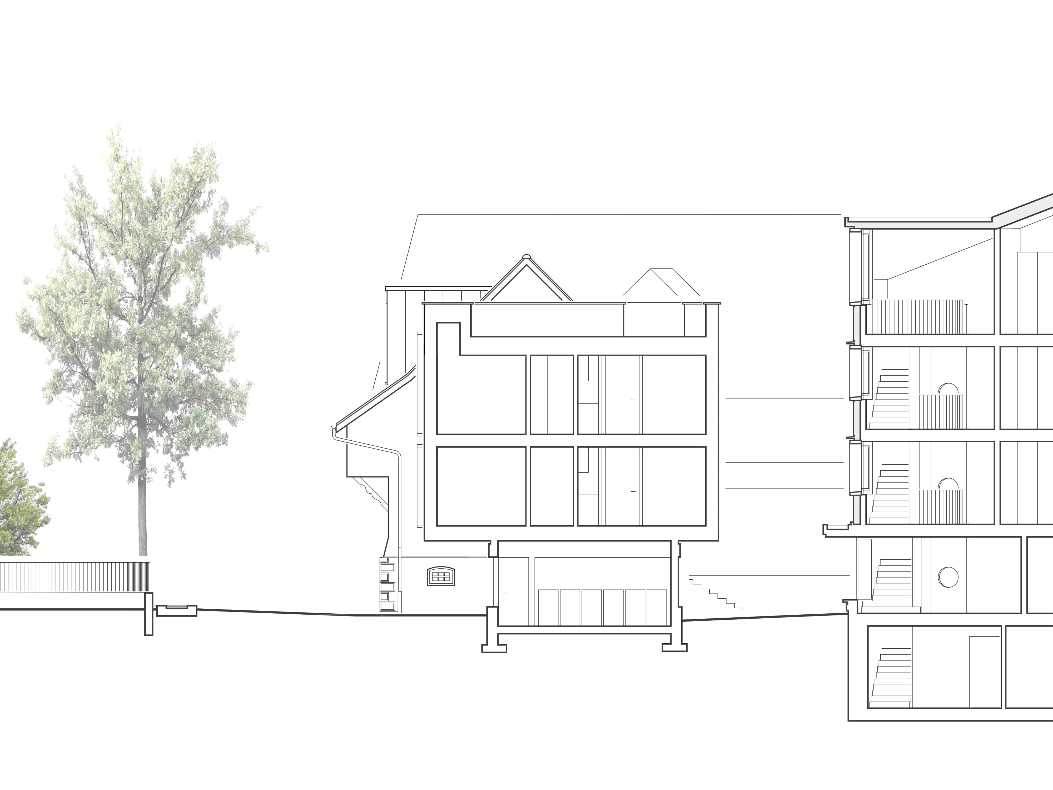 Die zwei im Obergeschoss liegenden Dalihaus-Wohnungen, sowie die beiden Wohnungen im Anbau werden über eine gut sichtbare Aussentreppe, welche zwischen beide Volumen geschoben ist, erschlossen. Die Treppe verbindet die unterschiedlichen Geschosshöhen des Dalihauses und des Anbaus. Der neue Zugang stellt eine wichtige Klärung bezüglich Adressierung der historischen Bausubstanz dar. Durch den Abbruch des Anbaus und der neuen Aussenerschliessung, welche nur über den Sockel mit dem Dalihaus verbunden ist, wird die beinahe quadratische Grundrissform des Hauses von aussen lesbar. Die Treppenanlage ist gegen Norden und Süden mit vertikalen Lisenen versehen. Diese dienen als Absturzsicherung, schützen subtil vor Einblicken und verbinden architektonisch den Anbau mit dem Dalihaus.