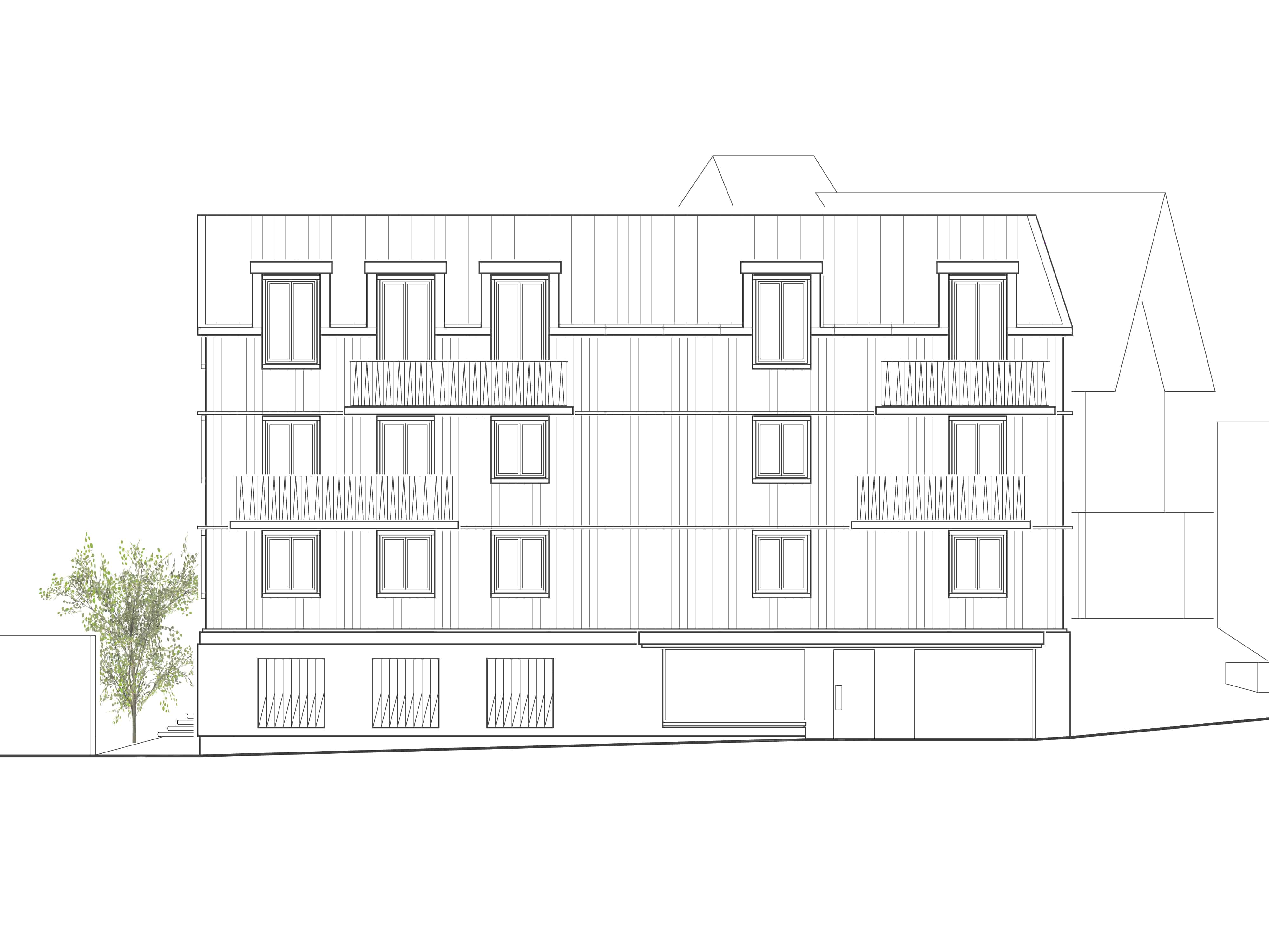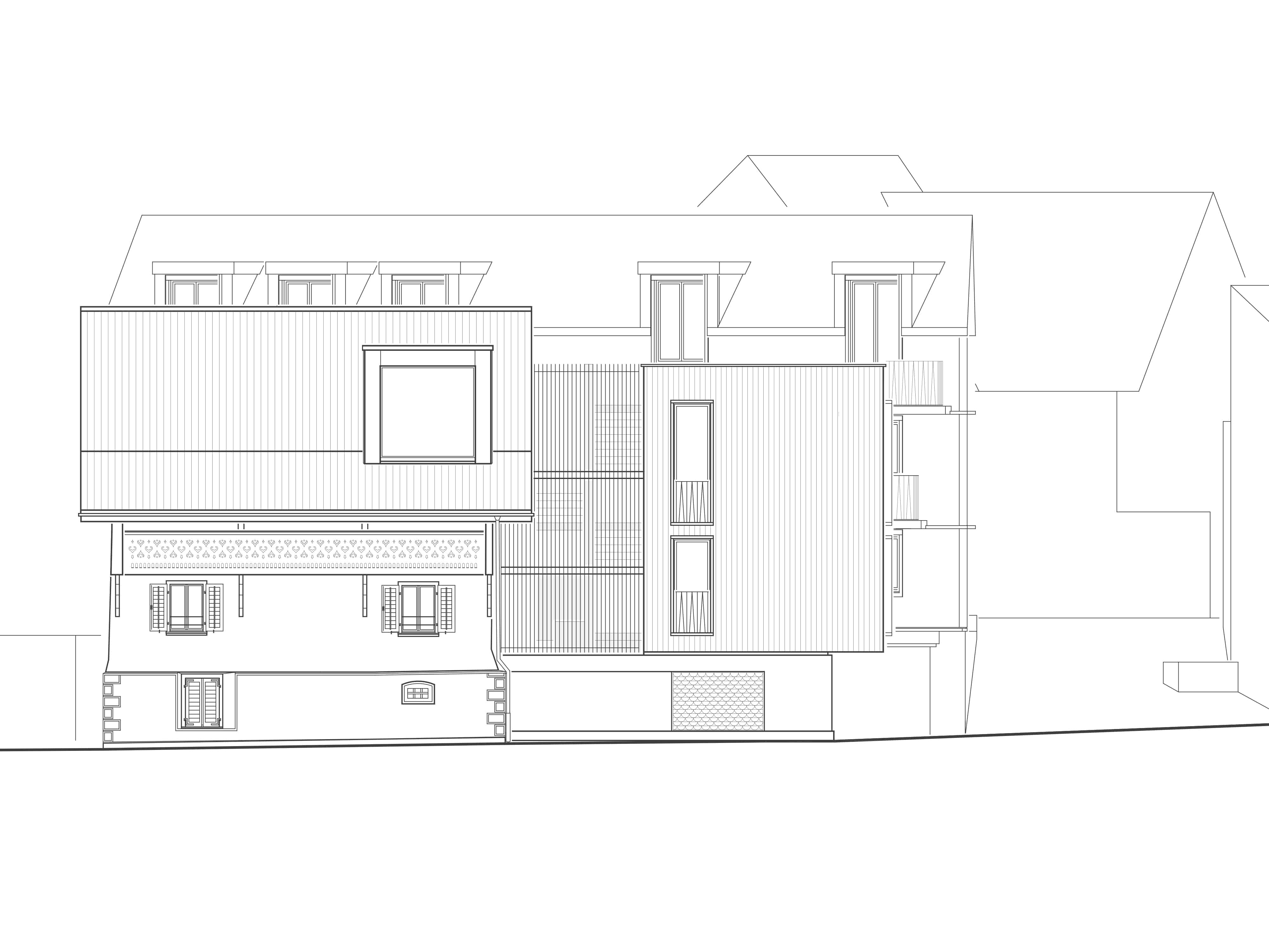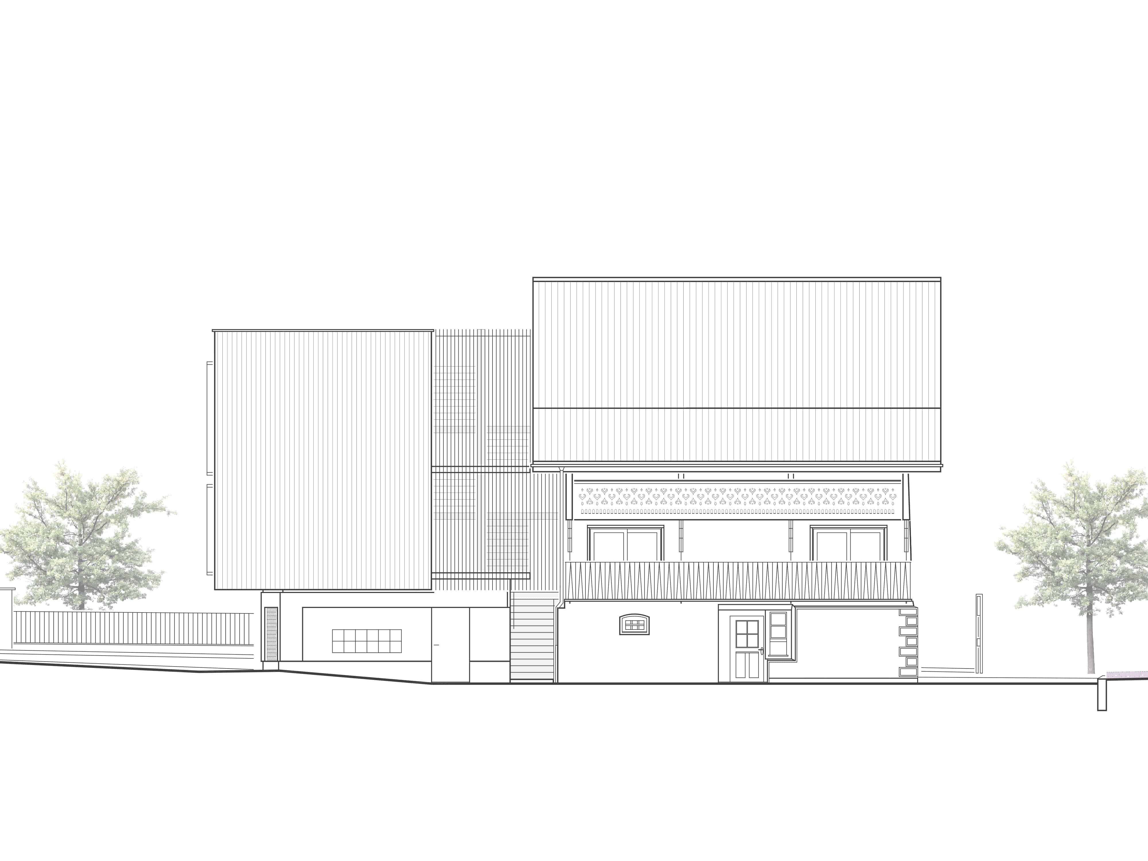 Der Anbau steht dreiseitig auskragend auf einem Sockelgeschoss und ist mit der vertikalen Erschliessung vom Dalihaus getrennt. In ihm sind zwei kleine 1 1/2-Zimmer-Wohnungen vorgesehen. Über den beiden Wohnungen befindet sich ein Aussenraum, welcher von allen Parteien des Dalihauses genutzt werden kann. Die Aussenhaut des Veloraums ist als Relief-Sichtbetonsockel geplant, der eine formale horizontale Verbindung mit dem Sockel des Dalihauses schafft. Ab dem Sockelgeschoss ist die Fassade mit Welleternit-Platten bekleidet, in Anlehnung an die Form der halbrunden Schindeln des Dalihauses.