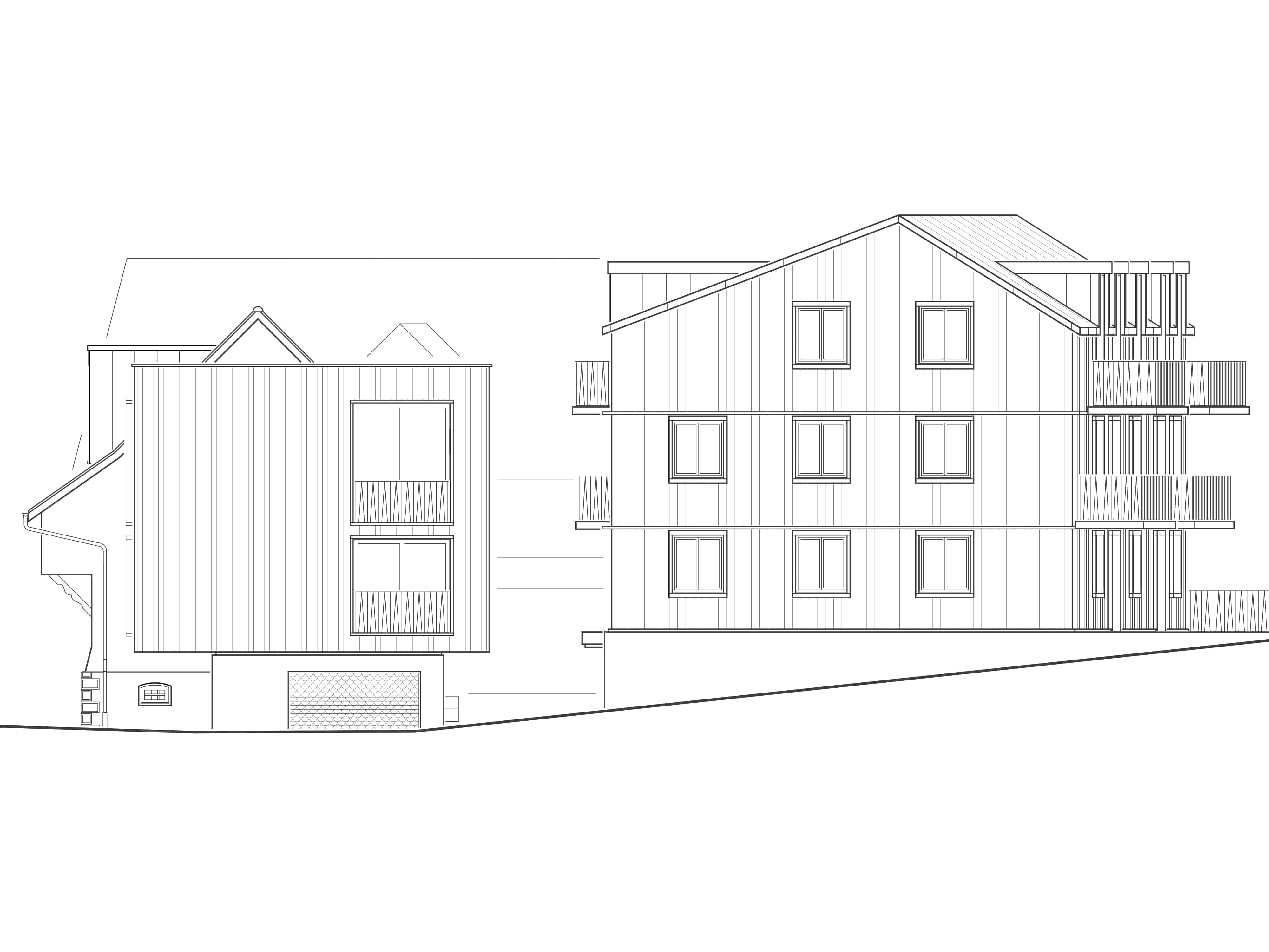 Die drei Wohnungen im Dalihaus werden innen und aussen saniert. Wie bereits vor der Sanierung in den 50er-Jahren prägen Holz-Schindeln ab dem Sockelgeschoss das neue äussere Erscheinungsbild. Der Boden der hier positionierten 1 1/2 Zimmer-Wohnung wird um eine Stufenhöhe abgesetzt um eine angemessene Raumhöhe zu erhalten. Direkt angegliedert ist der charakteristische Kellerraum mit historischem Tonnengewölbe. Die 3 1/2 Zimmer-Wohnung im 1. Obergeschoss bekommt gegen Süden eine Terrasse auf die gesamte Fassadenlänge. Der neue Aussenraum wird an der bestehenden Holzkonstruktion aufgehängt. Bei den Lauben der 3 1/2 Zimmer-Maisonette-Wohnung im 2. Obergeschoss wird die Laubsägeromantik der Absturzsicherungen wieder sichtbar gemacht. Zudem wird ein Teil des Dachgeschosses zu einer offenen Galerie ausgebaut. Das Dachgeschoss vom Dalihaus wird gegen Norden mit einer Kupferlukarne ergänzt. Sie tritt über ihre Materialität architektonisch in einen Dialog mit der Kupferdachlandschaft der neubarocken Kloster- und Pfarrkirche.